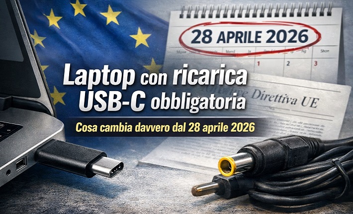 A partire dal 28 aprile 2026, tutti i laptop venduti nell’Unione Europea dovranno supportare la ricarica tramite porta USB-C. La misura deriva dalla Direttiva (UE) 2022/2380, già applicata dal 28 dicembre 2024 a smartphone, tablet e altri dispositivi. I laptop avevano ottenuto una proroga per via delle maggiori esigenze energetiche, ma quel tempo è ora esaurito.